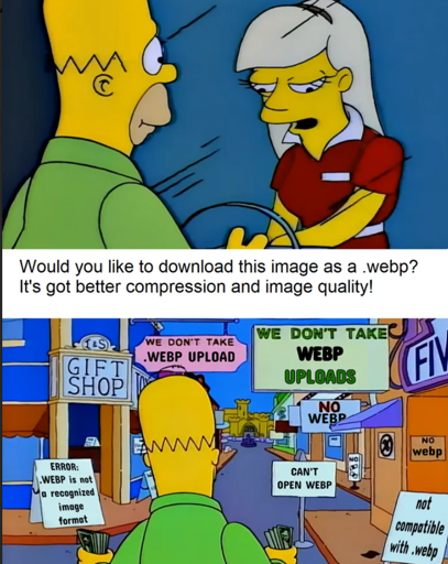 You know what? I just realized I haven’t actually tried to open a webp file in years. I’m just so used to cancelling the save dialog and taking a screenshot instead when I see a webp extension, I didn’t even consider it might actually be supported now.