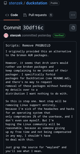 This is yet another example of someone being exhausted by the free and open source software community and specifically the Linux part of that community. At one point, we’re gonna need to take a long look at our communities and wonder why the fuck is it that this keeps happening? The amount of shit that maintainers have to deal with constantly is a massive issue. We have a cultural problem, one that we seemingly refuse to acknowledge.