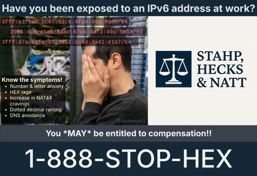 qaz@lemmy.world to Programmer Humor@programming.devEnglish · 17 days agoHave you been exposed to an IPv6 address at work?lemmy.worldimagemessage-square46linkfedilinkarrow-up1484arrow-down17