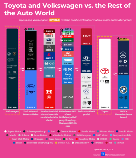 This chart breaks down the revenues for the world’s largest carmakers, grouping brands under their parent companies. The standout insight: Toyota and Volkswagen each generate annual sales on par with the combined totals of several other major automaker groups.