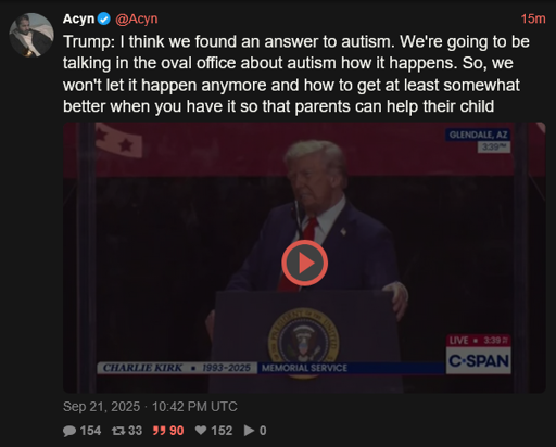 dead [he/him]@hexbear.net to El Chisme@hexbear.netEnglish · 5 months agoTrump says that tomorrow RFK and Dr Oz will announce the way to prevent of autismhexbear.netimagemessage-square87linkfedilinkarrow-up1160arrow-down10file-text