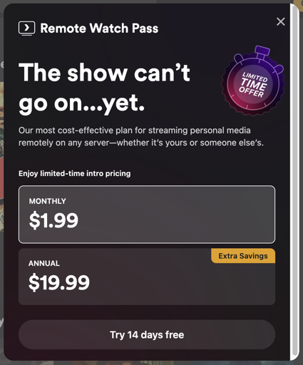 Correct. Remote streaming used to be free. That changed…in April? I don’t remember the exact date but it was announced earlier this year and has been slowly rolling out. Now you either have to have a Plex pass for your server or each user who wants to remote stream has to pay for a remote watching subscription and show in OPs screenshot.