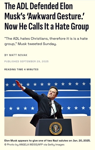 The actual article is even more funny. Apparently some guy took the ADL webpage for Christian Identity, an anti-semitic hate group, and just clipped off a screen shot of just the words “Christian Identity” being filled under “Extremism, Hate and Terrorism” and Musk 100% took the bait. https://gizmodo.com/the-adl-defended-elon-musks-awkward-gesture-now-he-calls-it-a-hate-group-2000665034