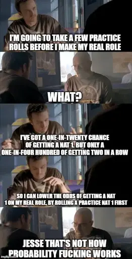 minus-squareCavemanfreak@lemmy.dbzer0.comlinkfedilinkarrow-up10·7 days agoThat’s what the meme says, but probability doesn’t work that way. If you want the result from a roll, what you’ve roller before has no bearing on the result from this roll. Thus the chance for a single d20 roll is always 1/20, or 5%.