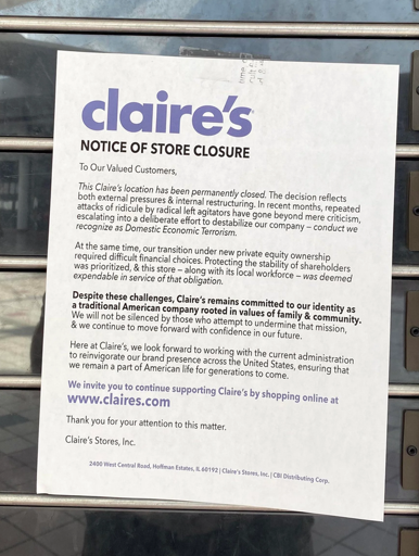 If I posted this to UK spaces without comment people would stop going to Claire’s and find somewhere else to go because they don’t want to support insane far right companies. Whoever wrote this is seriously out of touch and does not realise that the way their company behaves in one territory can and will affect them in other territories as well. Trying to pander to the right with a “we’re closing because of leftists please support us” might work for idiotic americans but it makes the whole company look insane anywhere else in the world.