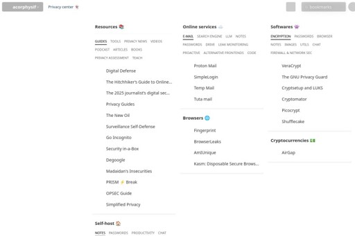 hereforawhile@lemmy.ml to Privacy@lemmy.ml · 4 days agoNice little collection of privacy toolsstart.meexternal-linkmessage-square18linkfedilinkarrow-up1183arrow-down16cross-posted to: privacy@lemmy.dbzer0.comprivacy@programming.dev