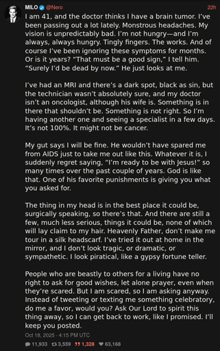 dead [he/him]@hexbear.net to Slop.@hexbear.netEnglish · 1 month agoMilo Yiannopoulos says he might have brain cancerhexbear.netimagemessage-square92linkfedilinkarrow-up1117arrow-down10file-text